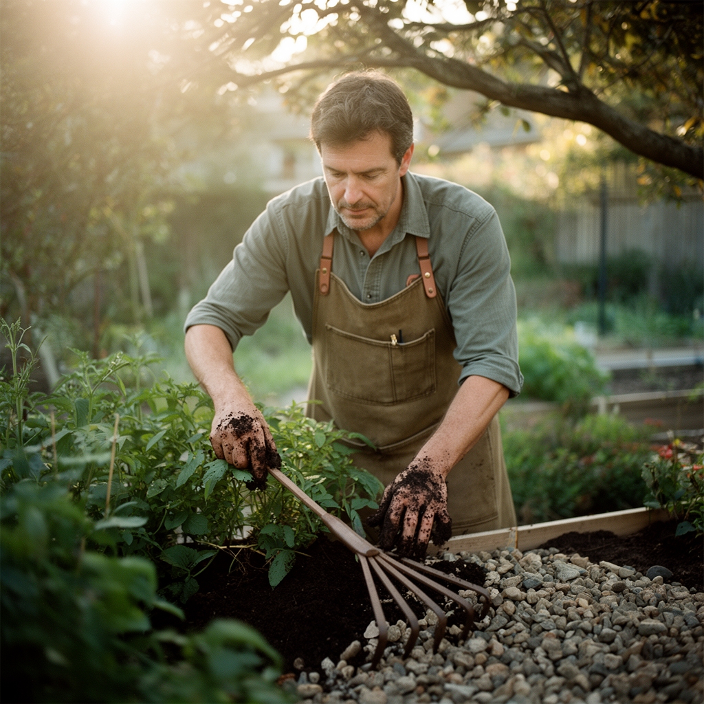 Companion materials include a steel garden rake (thinner tines for finish work), a tamper for compaction, and landscape fabric with 3-ounce-per-square-yard density. Apply a base layer of decomposed granite at 2-inch depth before adding decorative gravel. This substrate stabilizes the surface and prevents aggregate migration into underlying soil.